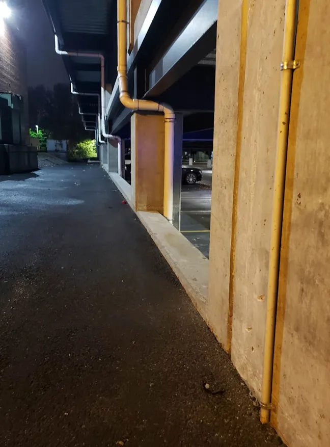 I started thinking about where to spend the night when it began raining on my walk back. It’s hard to find somewhere dry: the doorways with overhangs are well lit, and trees won’t keep you dry. I considered sleeping between some shipping crates or in a fenced lawn-equipment area, but eventually chose an alleyway partially covered by the overhang of a parking garage in a more industrial part of campus. The ground was asphalt, but it was dry and looked to be staying that way. There was also only one long unobstructed lines of sight; it was closed in on the other three sides.