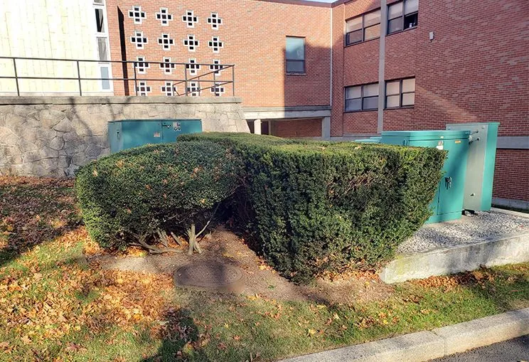I left the auditorium around midnight. I spent an hour looking for a comfortable and well-hidden place to sleep, but couldn’t find one. In the end, I got antsy about the number of police cars driving by me and settled on a clump of three bushes next to a transformer.