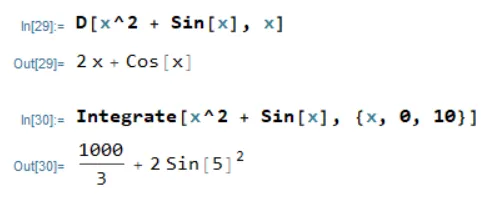 Both D[] and Integrate[] take the variable(s) to integrate or differentiate with respect to as parameters after the expression. If you want a definite integral, you can pass bounds of integration for each variable with {x, 0, 10} instead of x, like we do above.