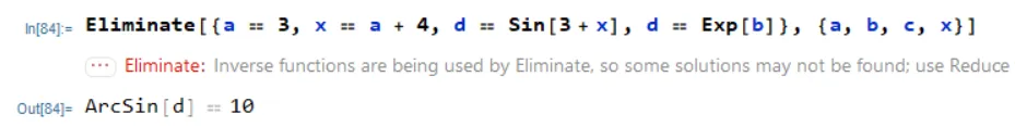 The third horseman is Eliminate. It combines equations to eliminate variables. It’s useful when you have a mess of variables and equations, and you want to reduce your system to a single equation. It takes the list of equations as the first parameter, and the variables to eliminate as the second parameter.